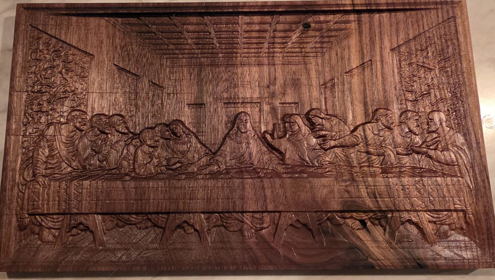 Solid black walnut Last Supper wall art featuring a detailed 3D carved relief. Measuring 11″ × 8″ × 0.5″, this handcrafted piece therefore offers timeless Christian décor and meaningful religious significance.