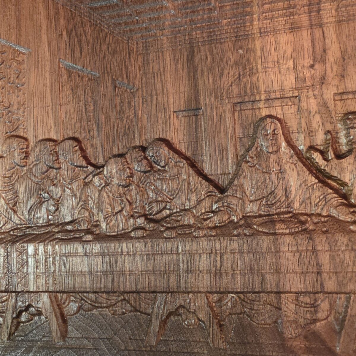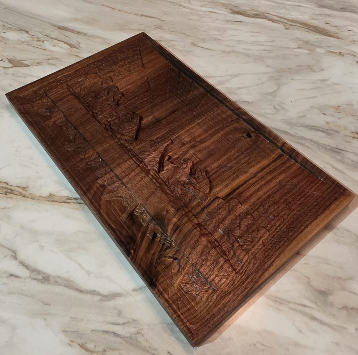 As light moves across the surface, the three-dimensional carving brings each figure to life. Expressive faces, flowing robes, and architectural detail emerge naturally. Moreover, the rich walnut grain adds warmth and character, ensuring that every piece remains truly one of a kind.