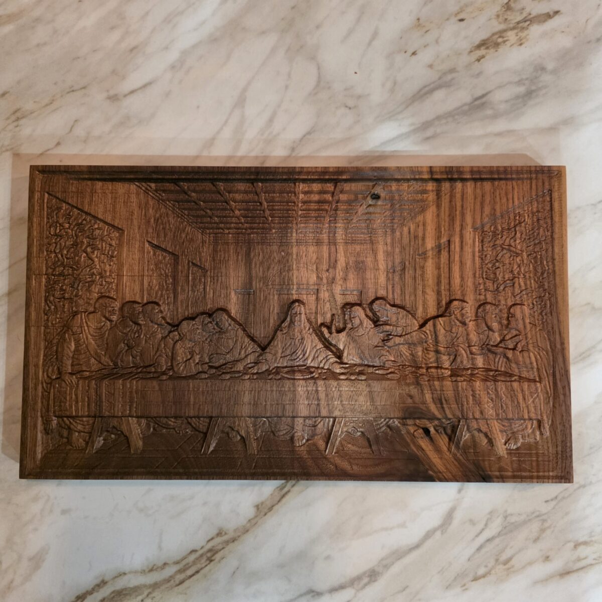This Black Walnut Last Supper wall art captures one of the most meaningful moments in Christian history through a finely detailed 3D carved relief. From the very first glance, the depth and craftsmanship stand out. Crafted from a single solid piece of premium black walnut, this artwork measures 11″ × 8″ × 0.5″ and highlights both dimensional detail and natural beauty.