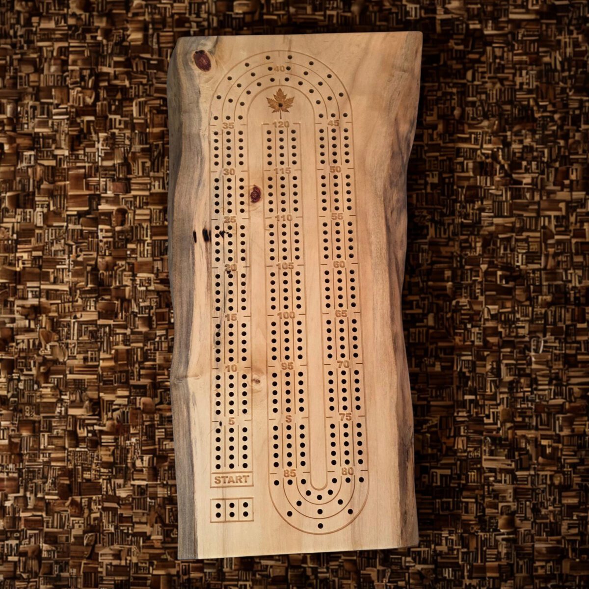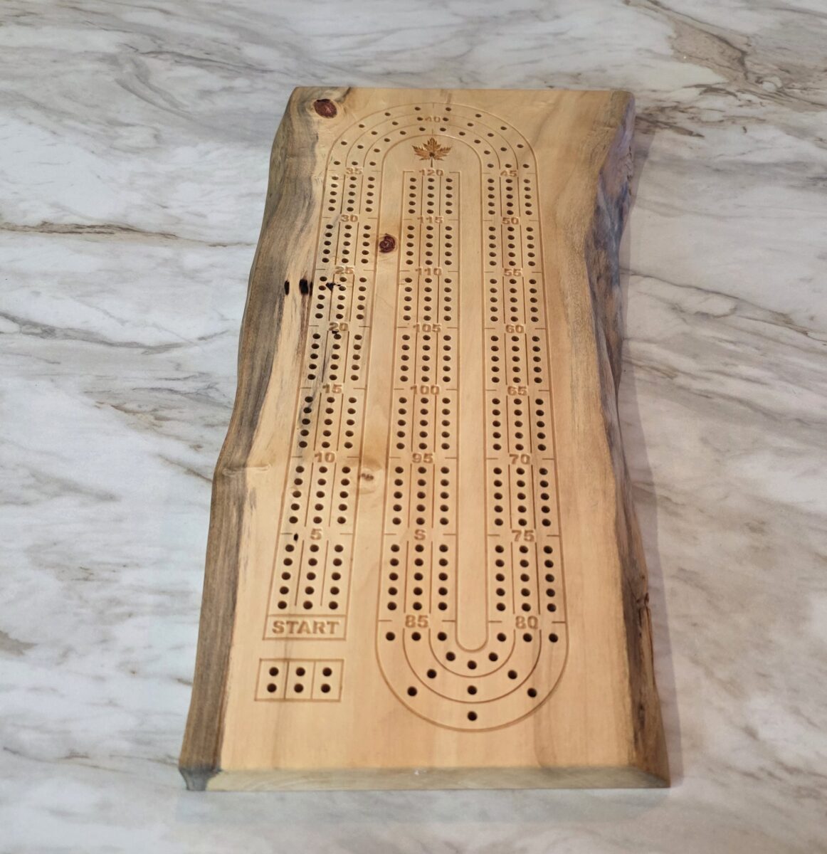Handcrafted live edge cribbage board made from Manitoba Maple. Features a classic 120-point layout, nonslip rubber feet, and a durable tung oil finish. Personalize with initials, messages, or logos for the perfect gift. Also available in Ambrosia Maple and Aromatic Cedar.